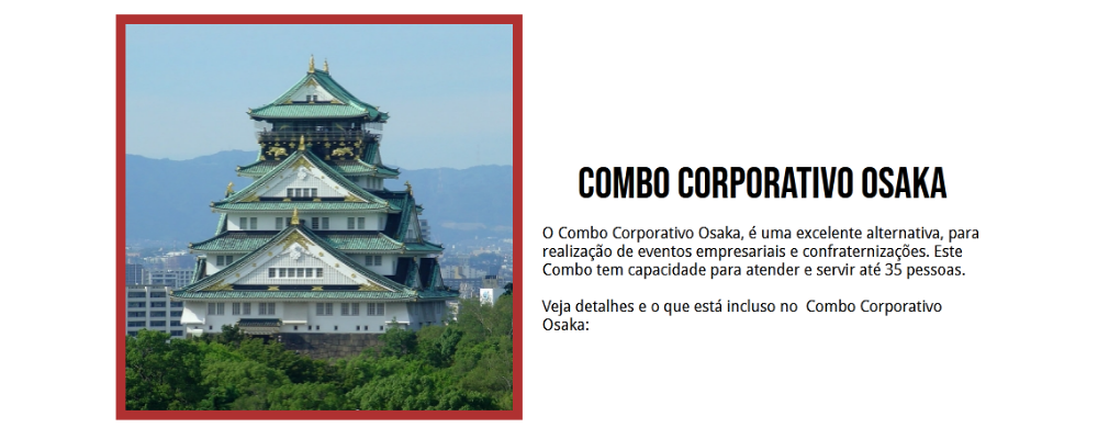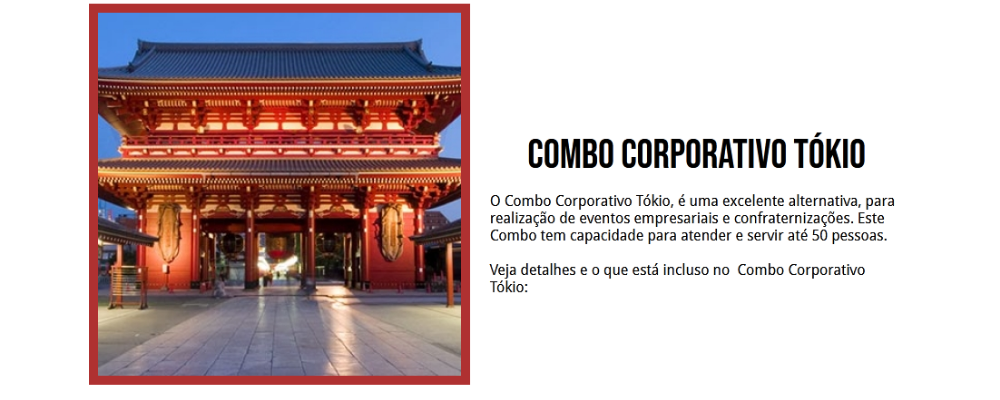 Para eventos empresaria ou corporativos oferecemos todas as opções dos cardápios do Buffet Japonês ou Almoço e Jantar, além destas opções já tradicionais, também oferecemos pacotes especiais para empresas. Que somente são disponibilizadas para Pessoas Jurídicas, devidamente comprovadas no ato de formalização do contrato.